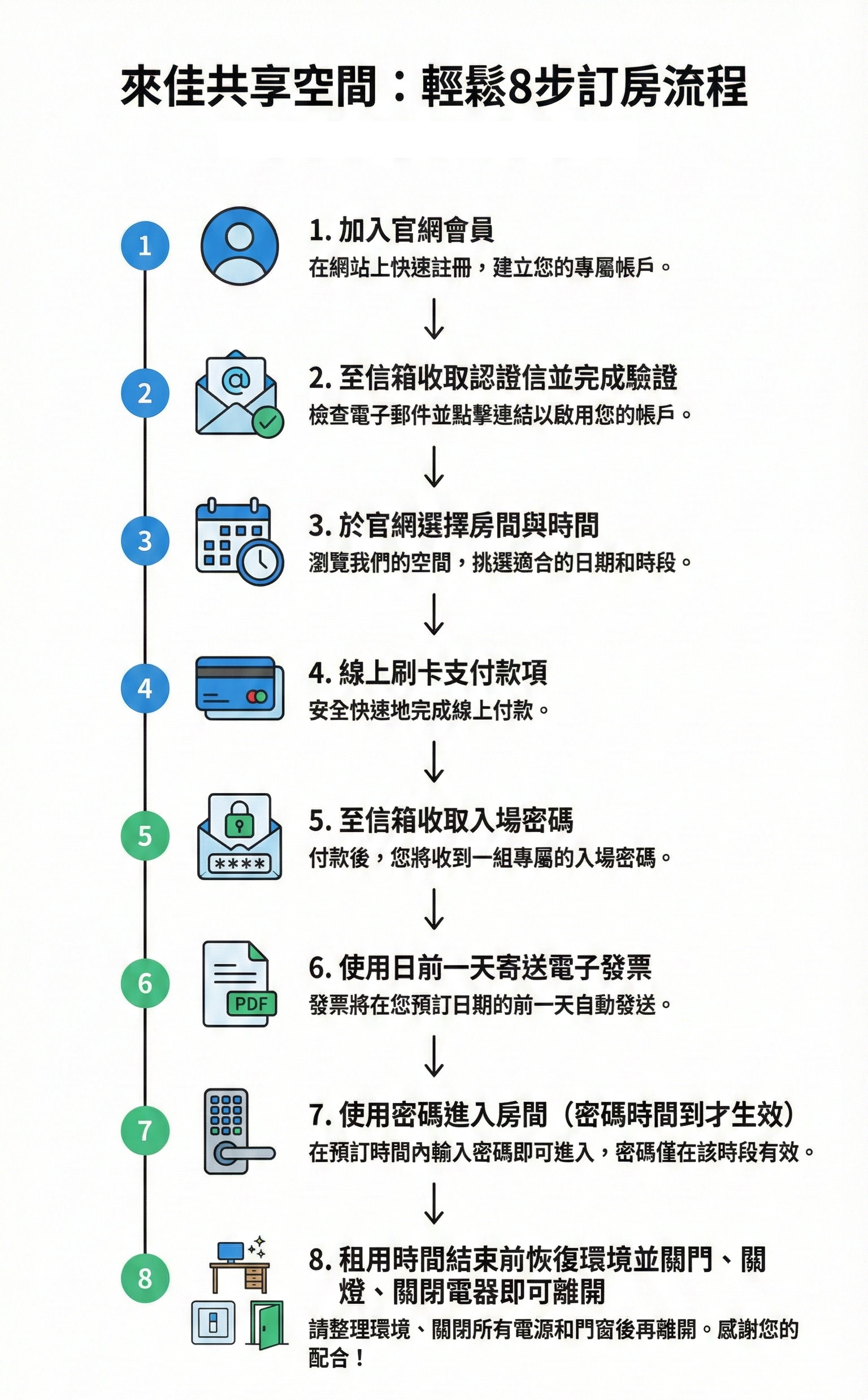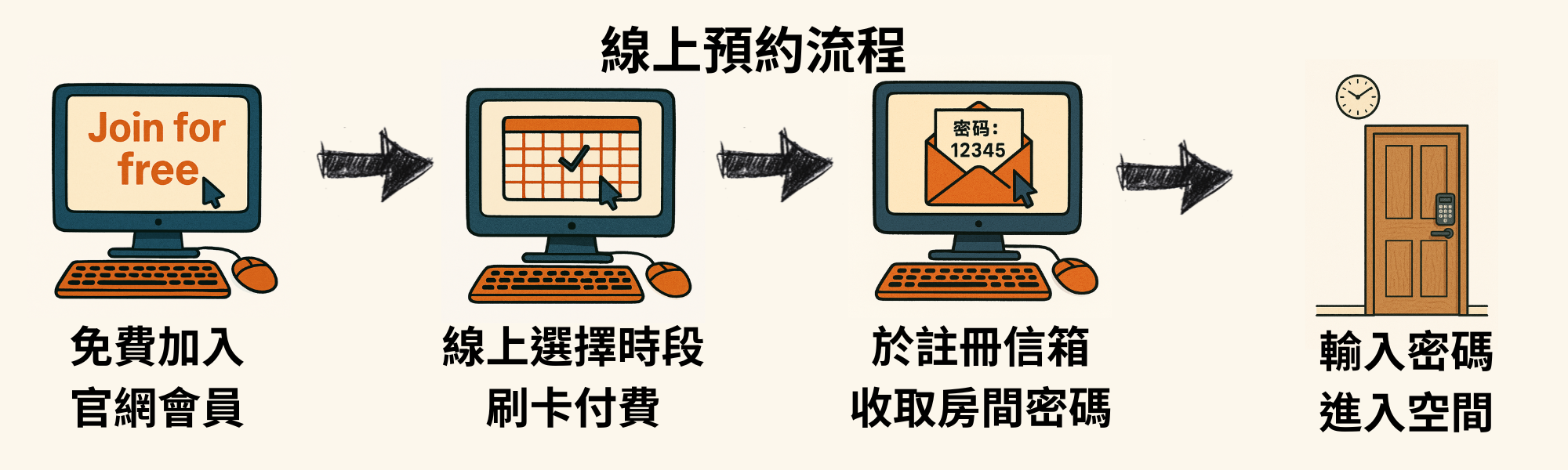 備有白板與光纖網路的來佳是您的靈活辦公場所。視訊、開會、面試、商品展覽......等,獨立空間自由運用,加入會員用越多省越多。
