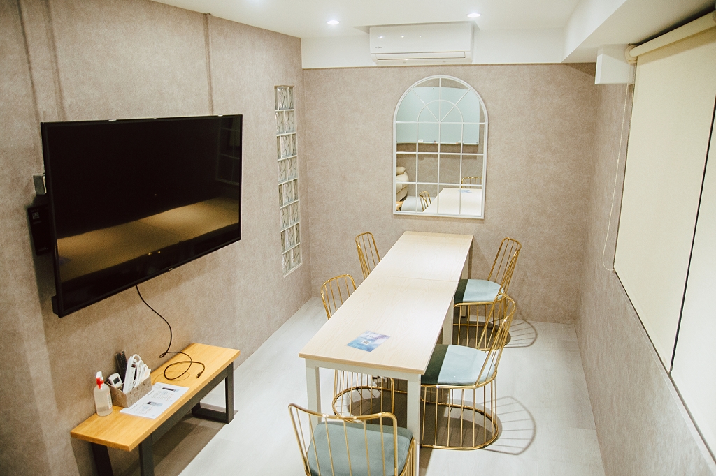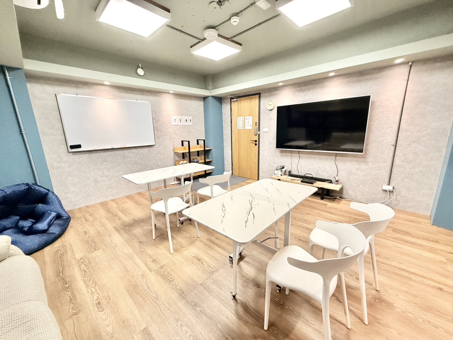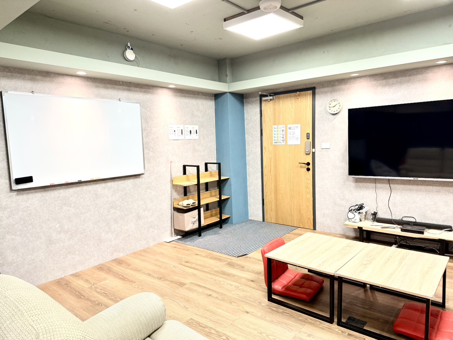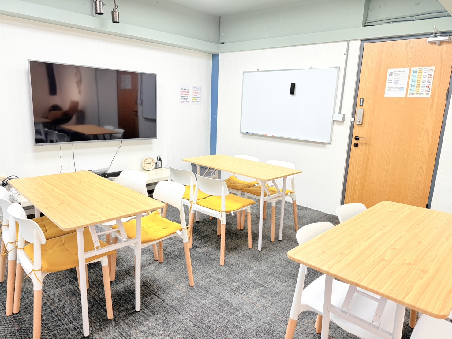 面積:6.2坪、對外窗(可開啟)人數:12人以下器材:300mb/s無線Wifi(不提供實體網路孔)、70吋4K螢幕(沒有電視頻道、不能連網)、音霸、HDMI線材、冷暖氣、固定式白板(含板擦白板筆)