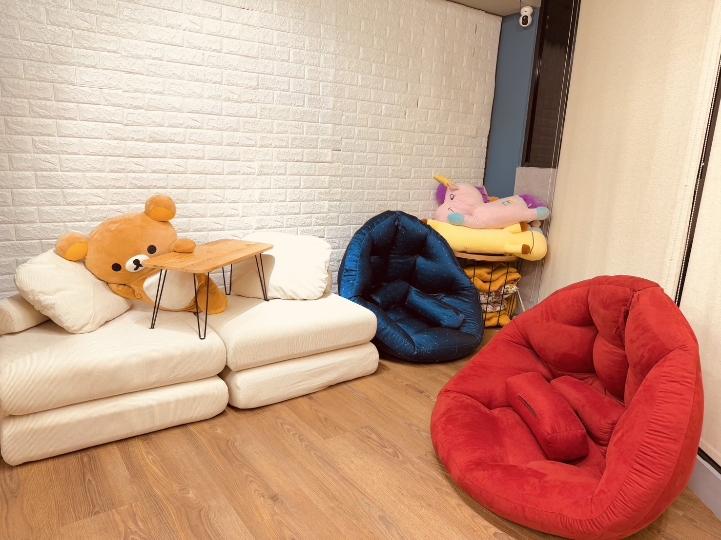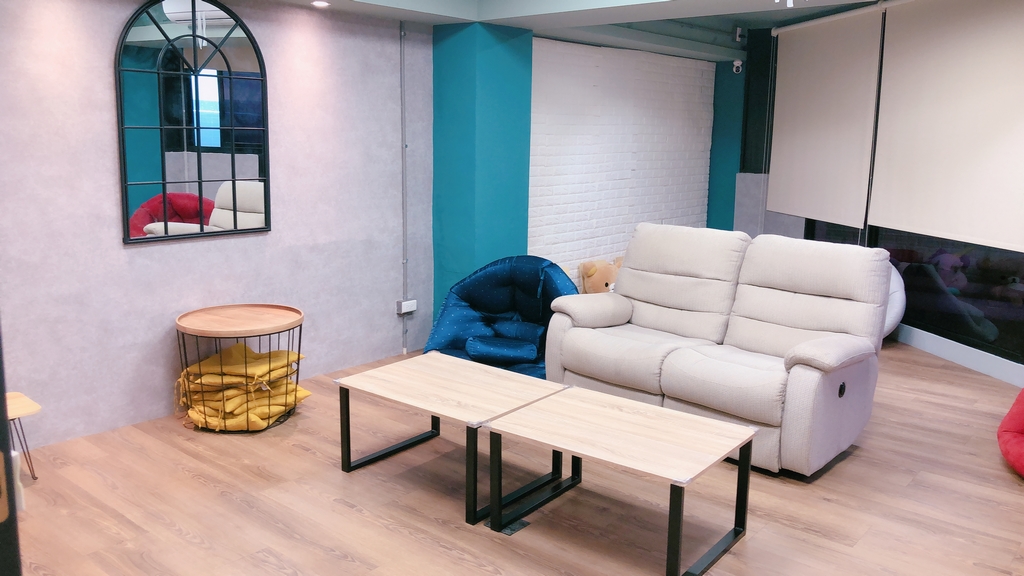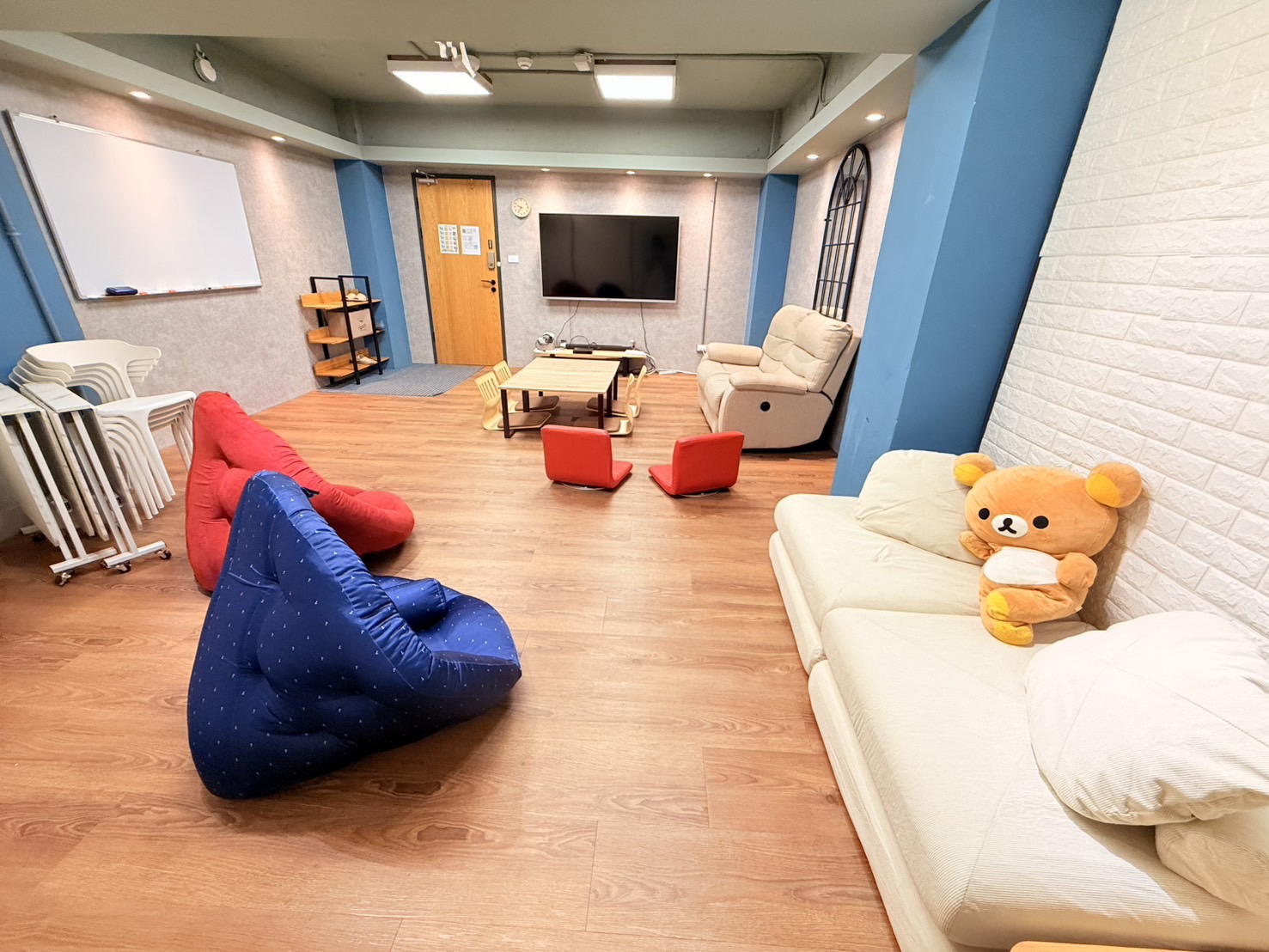 家具:懶骨頭*2、豆腐模塊沙發*2(80*80cm 可分開成4個軟墊)、和室椅*6、和室桌*2、雙人沙發*1、摺疊桌(60*120cm)*2、塑膠椅*5。可自行排列,離開前需歸位,請勿將家具搬出房間此房間有一面是落地窗,請使用者注意安全,並照看您攜帶的幼童,以免發生意外。每小時價格: