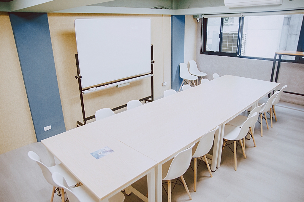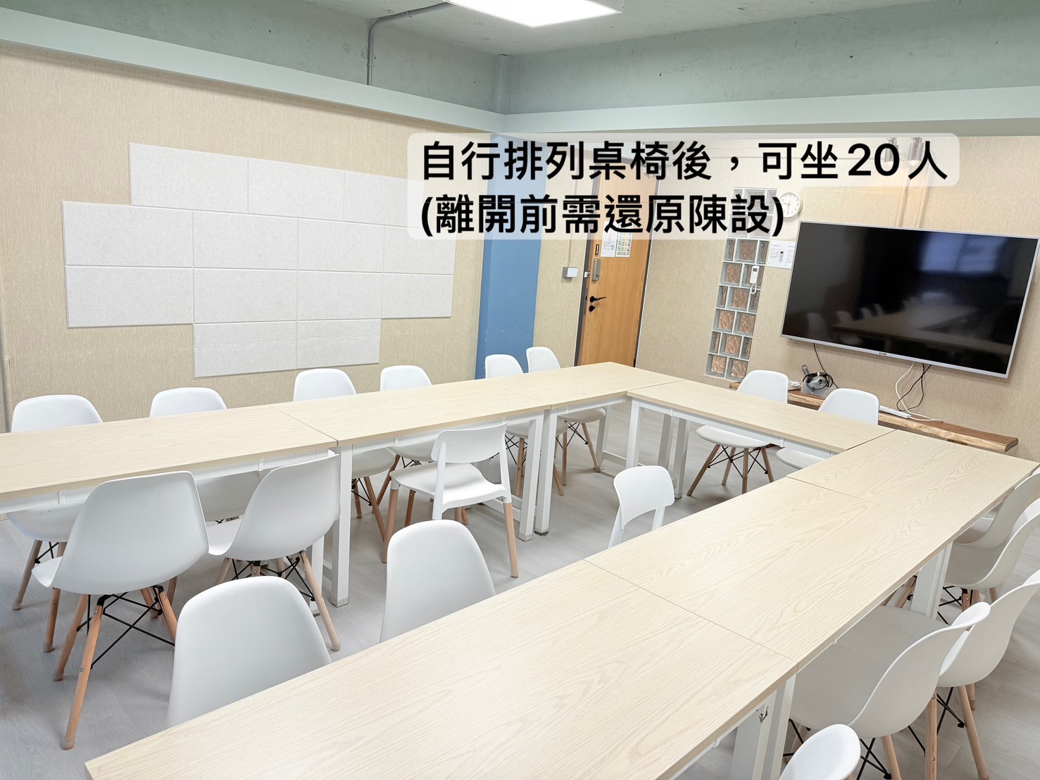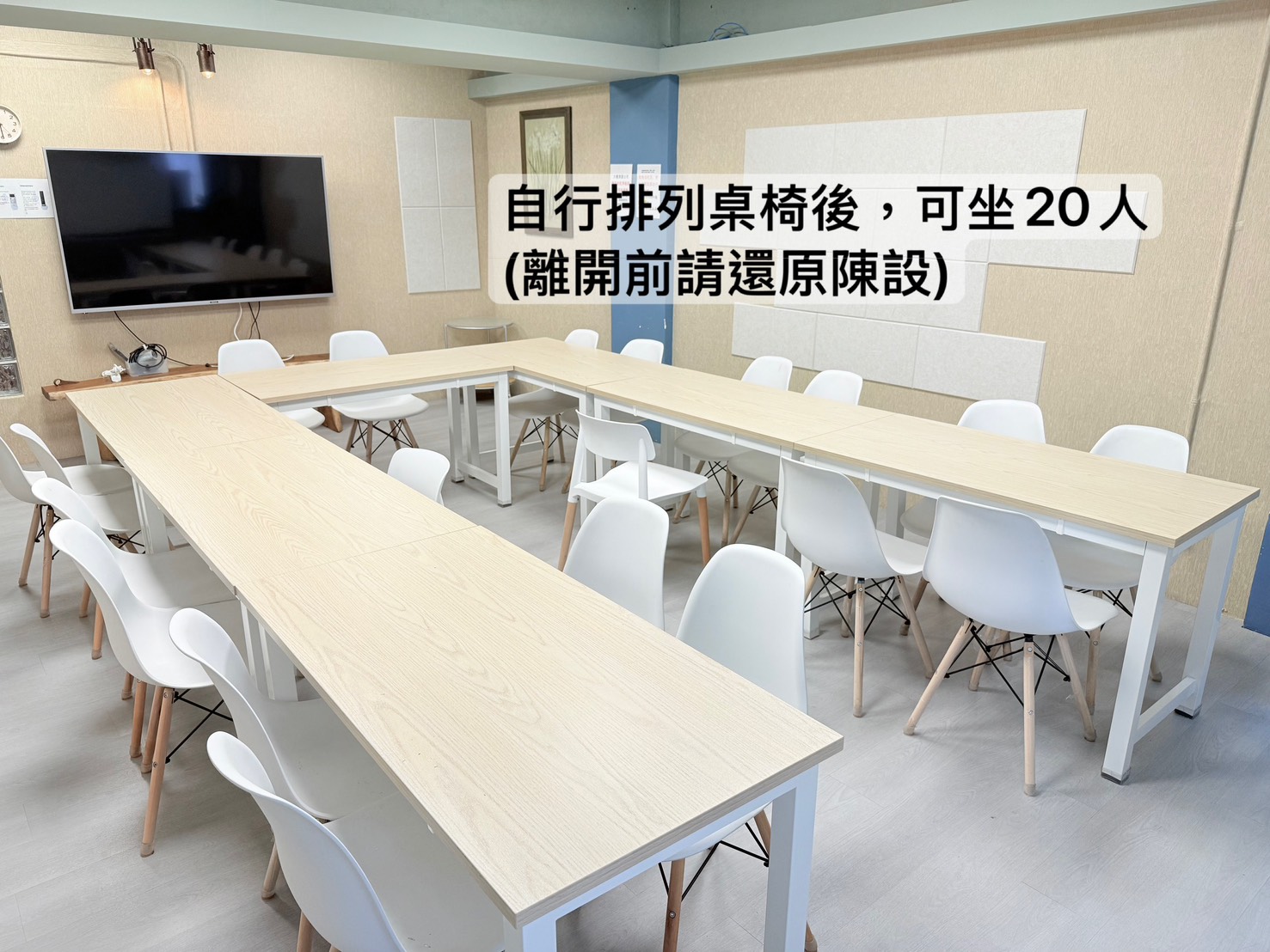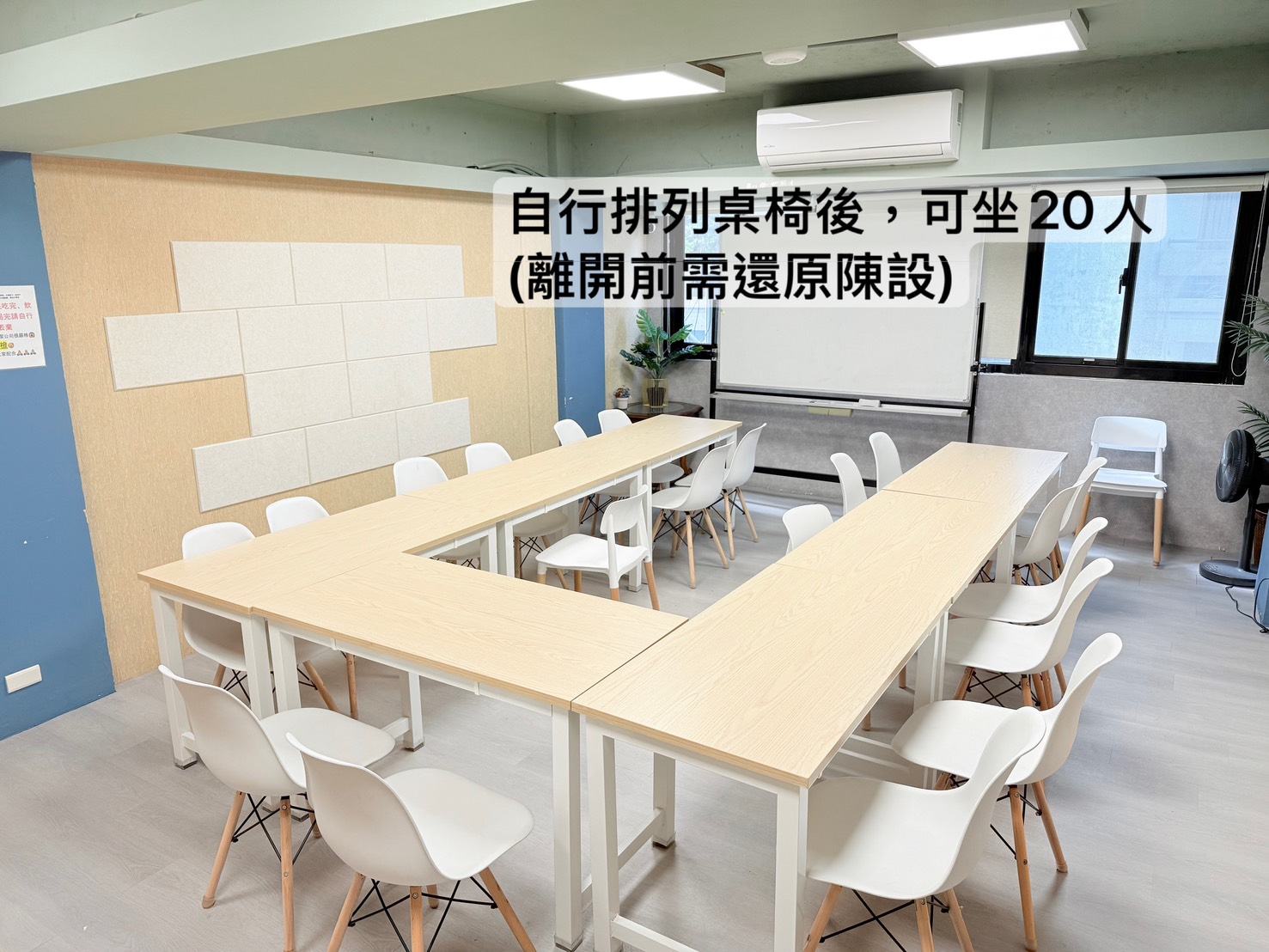 面積:9.4坪、對外窗(可開啟)人數:20人(需自行重排桌椅)、16人(寬敞舒適)器材:300mb/s無線Wifi(不提供實體網路孔)、70吋4K螢幕(沒有電視頻道、不能連網)、HDMI線材、移動式白板(含板擦白板筆)、冷暖氣家具:桌子尺寸60*120cm 7張、椅子*20,可自行排列,離開前需歸位,請勿將家具搬出房間每小時價格: