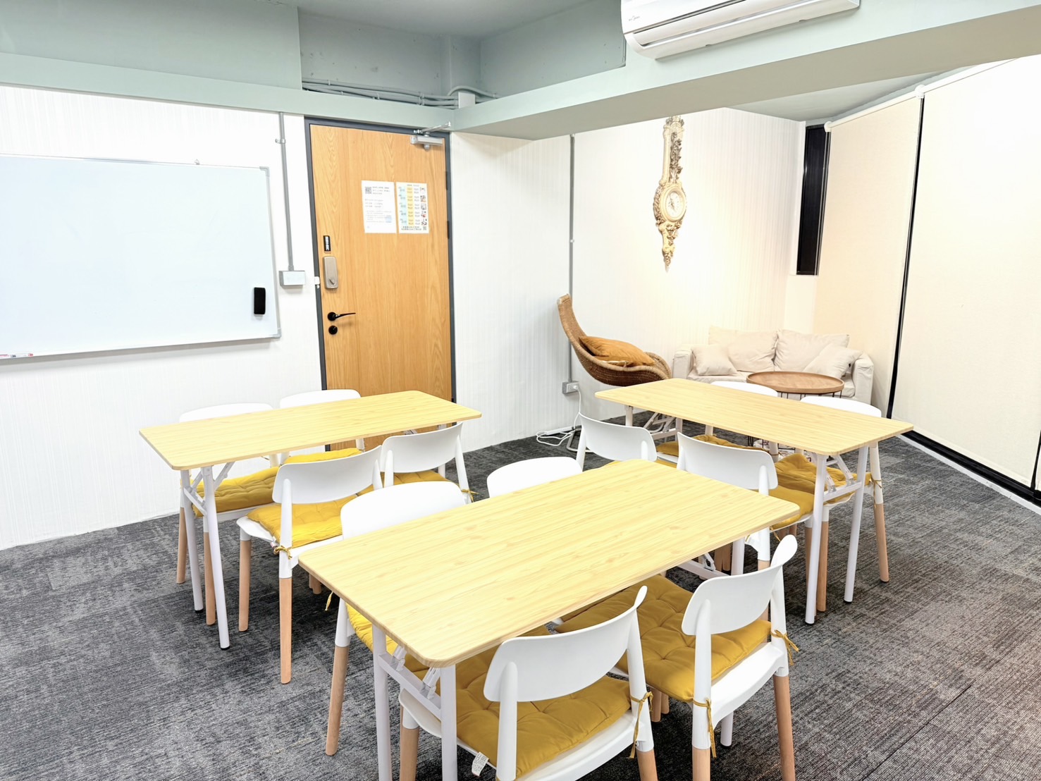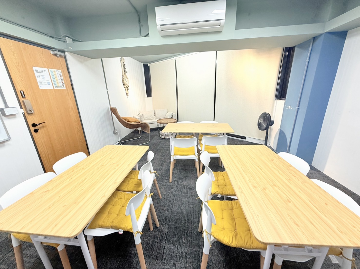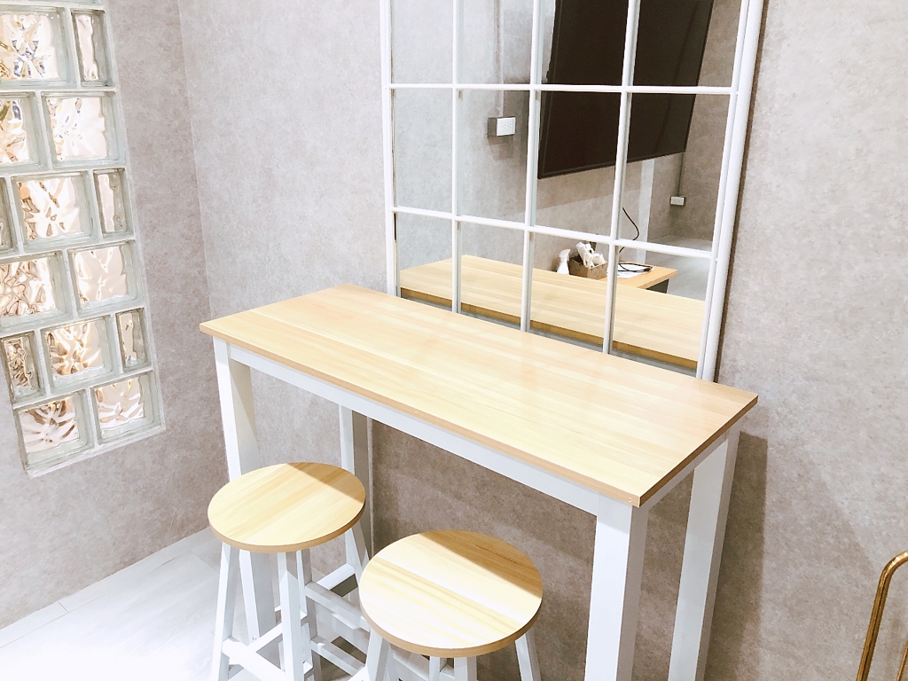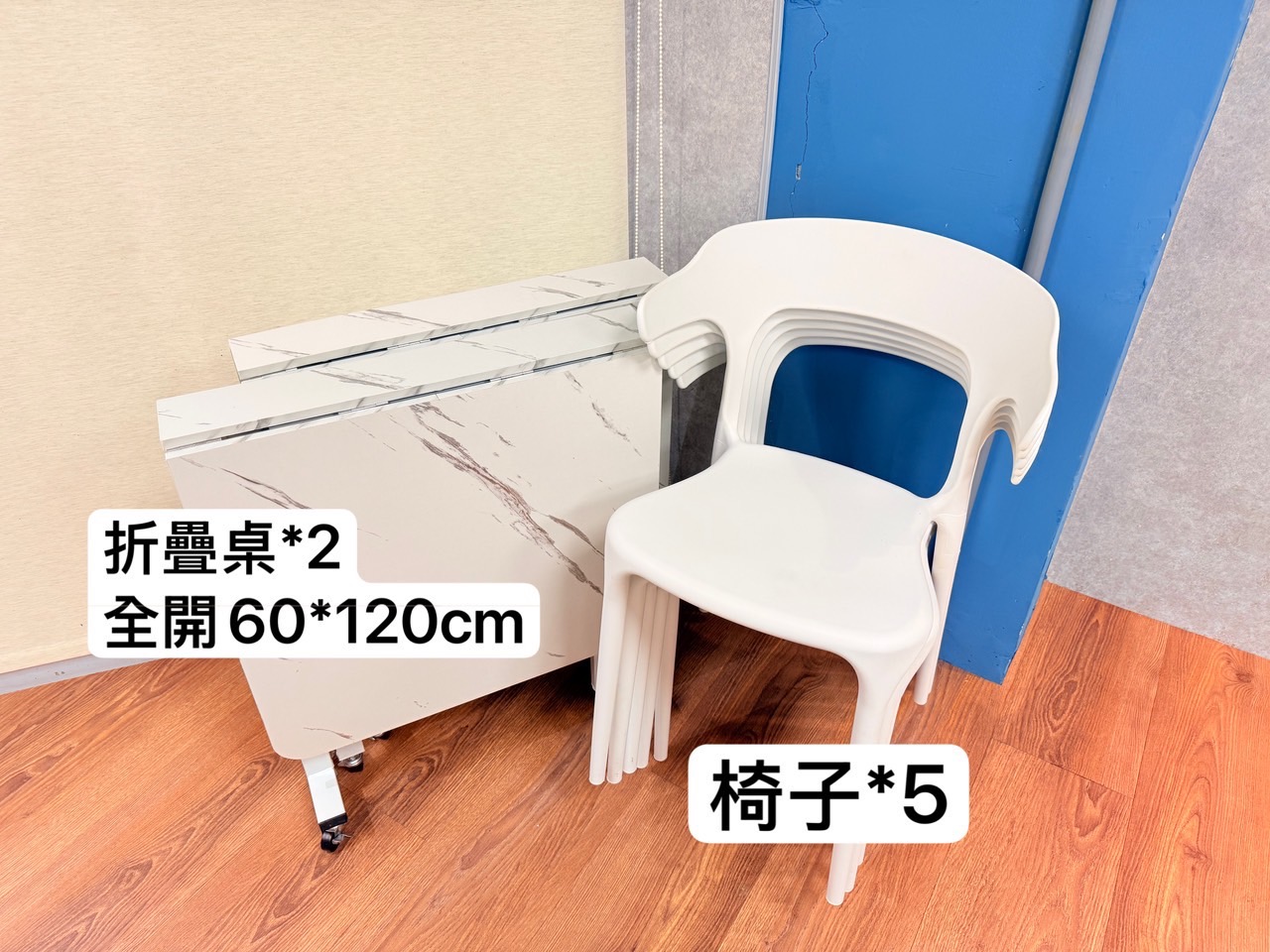 家具:桌子*2(60*120cm)、椅子*5、長條邊桌*2、高腳椅*2 可自行排列,離開前需歸位,請勿將家具搬出房間每小時價格:
