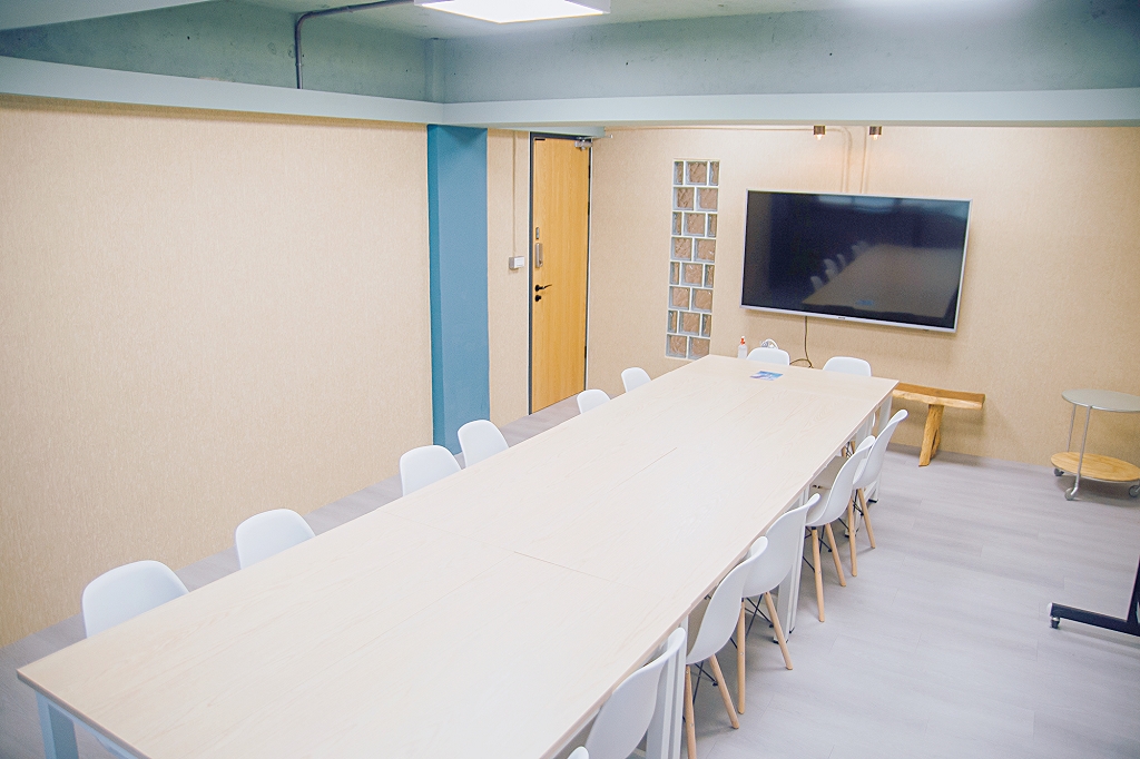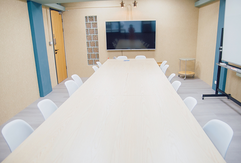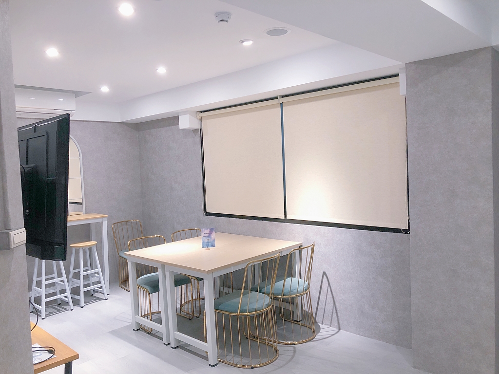 面積:6.7坪、對外窗(可開啟)人數:17人以下器材:300mb/s無線Wifi(不提供實體網路孔)、70吋4K螢幕(沒有電視頻道、不能連網)、音霸、HDMI線材、冷暖氣、藍光機、固定式白板(含板擦白板筆)
